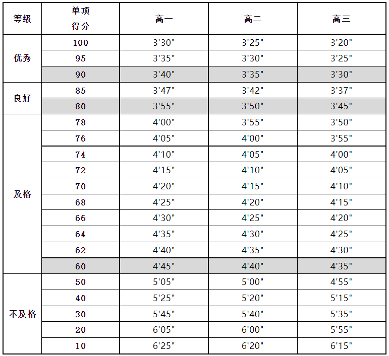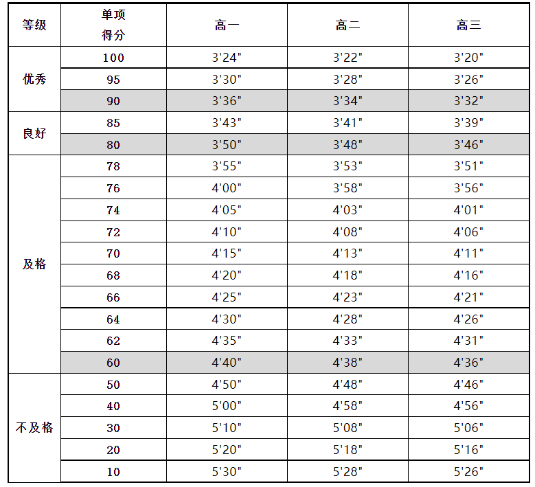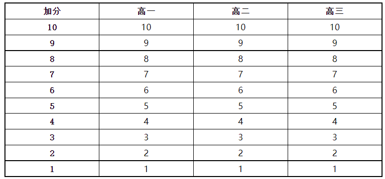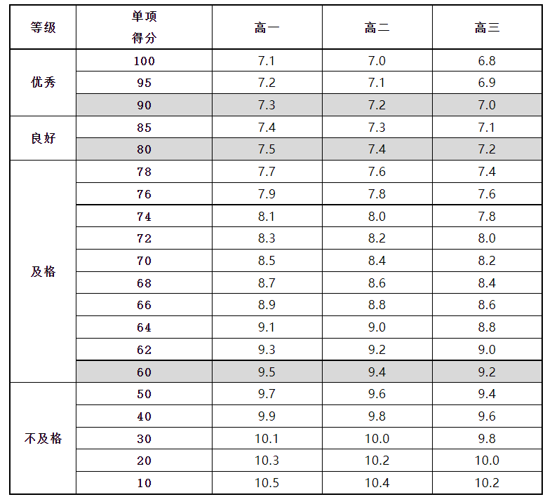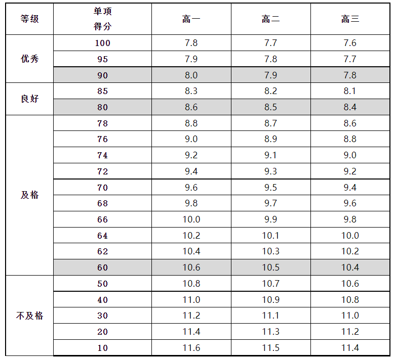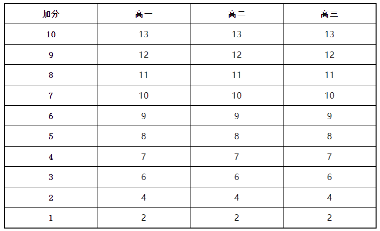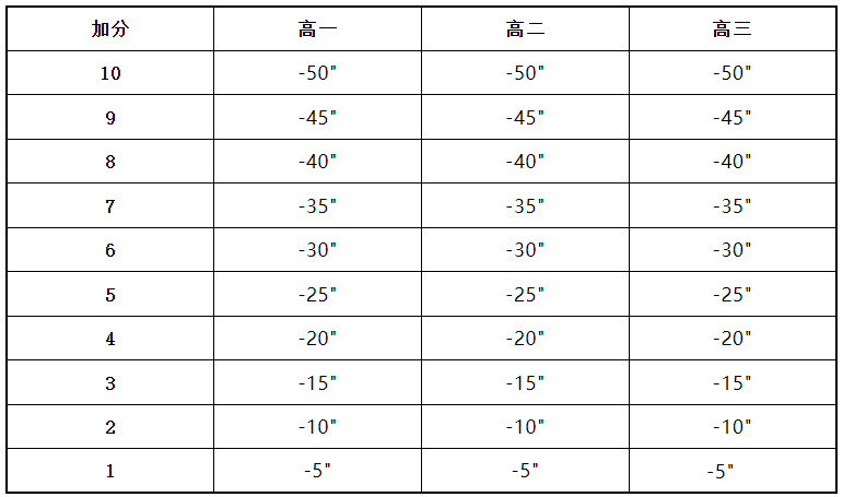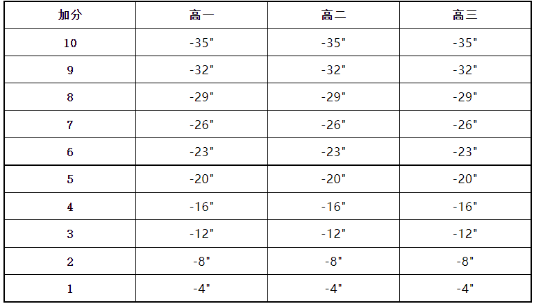 注:1000米跑、800米跑均为低优指标,学生成绩低于单项评分100分后,以减少的秒数所对应的分数进行加分。