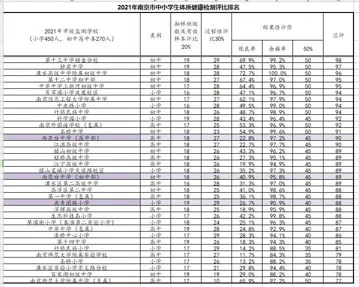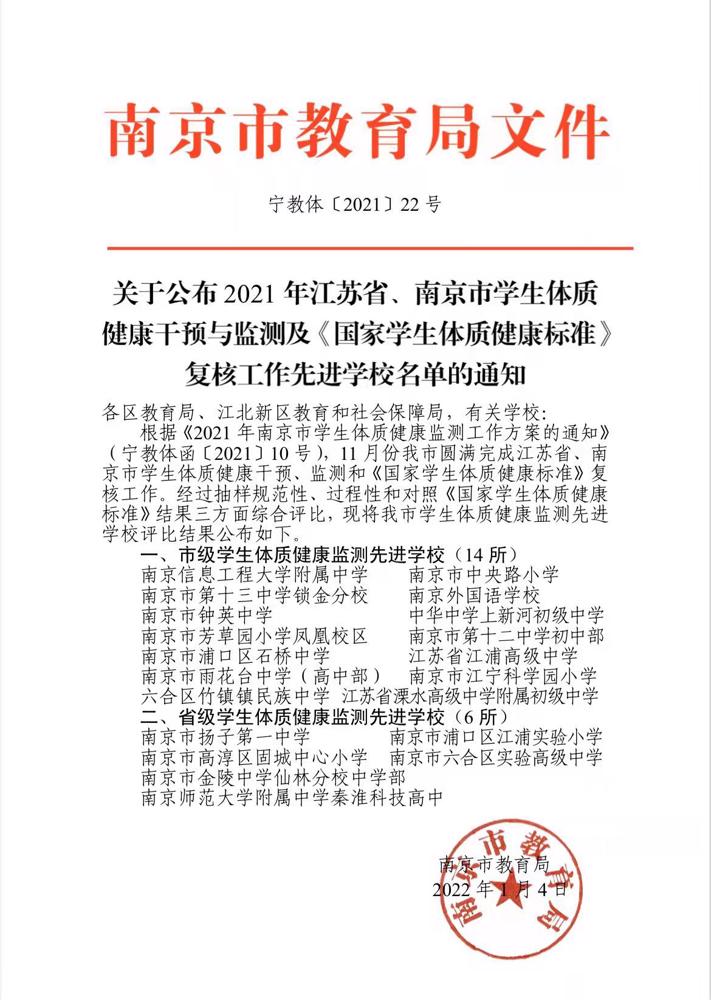 2021年雨高、雨初、共小代表我区参加南京市中小学生体质健康抽测(中学抽测270人、小学抽测450人)中,成绩优异,其中雨花台高中排名全市高中校第二名获得“南京市中小学生体质健康监测先进学校”荣誉。