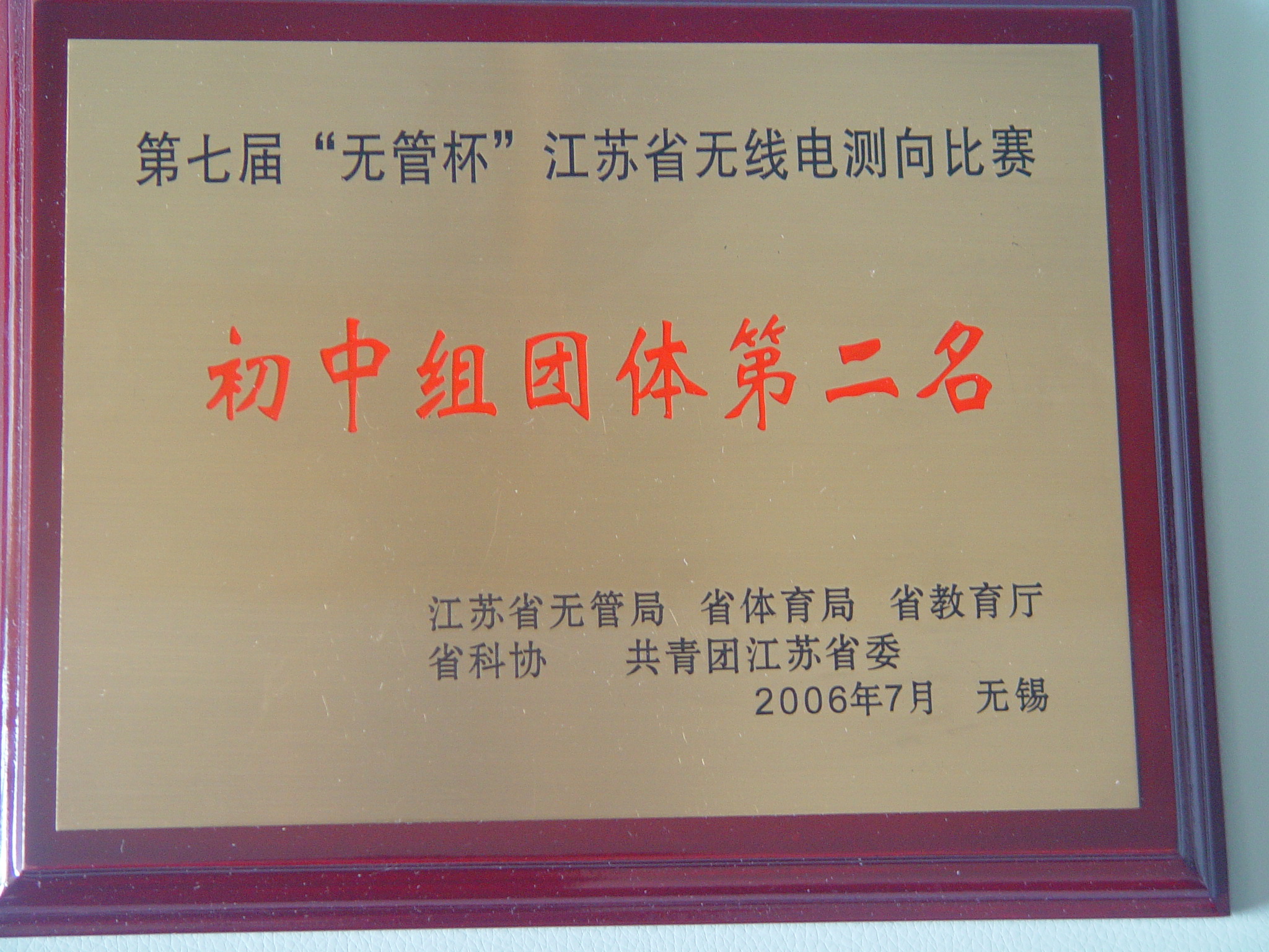 | 体育组 | 2006.7 | 江苏省第七届无线电测向比赛初中组团体第一名 | 江苏省 | 省体育局 省教育厅 | 卞明 | |