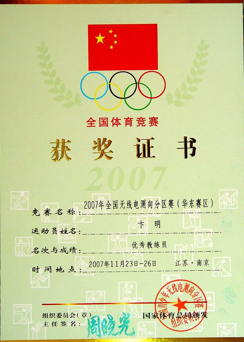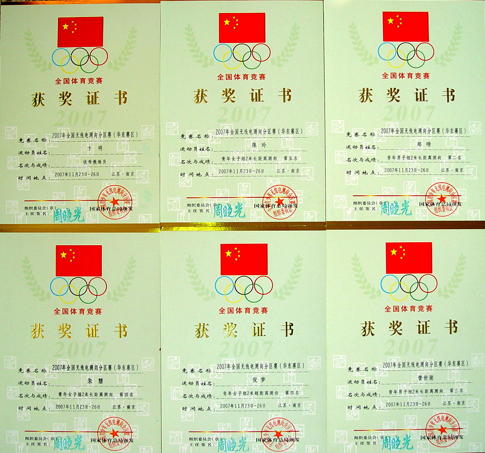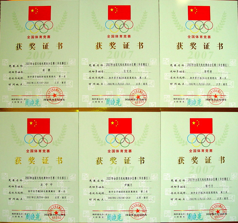 我校无线电测向队在2007全国比赛中荣获团体冠军,王文杰等4名学生获单项第一名,卞明老师获优秀教练员