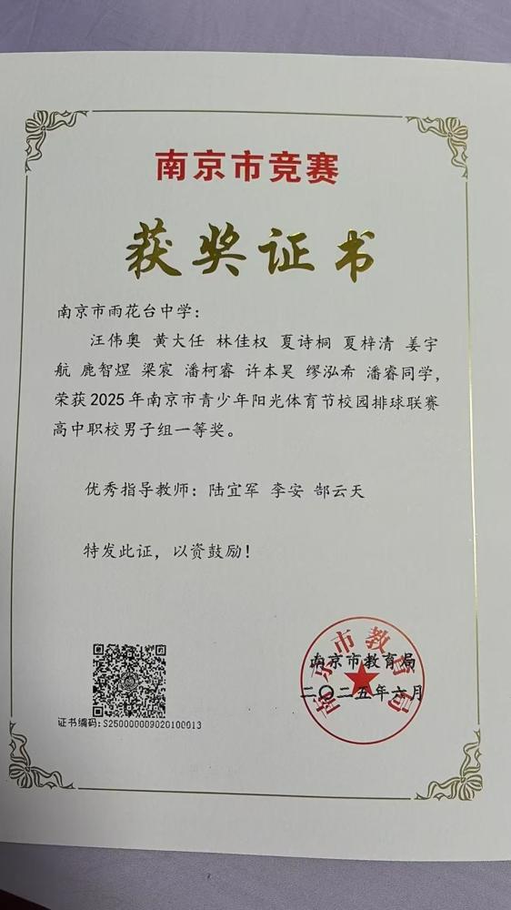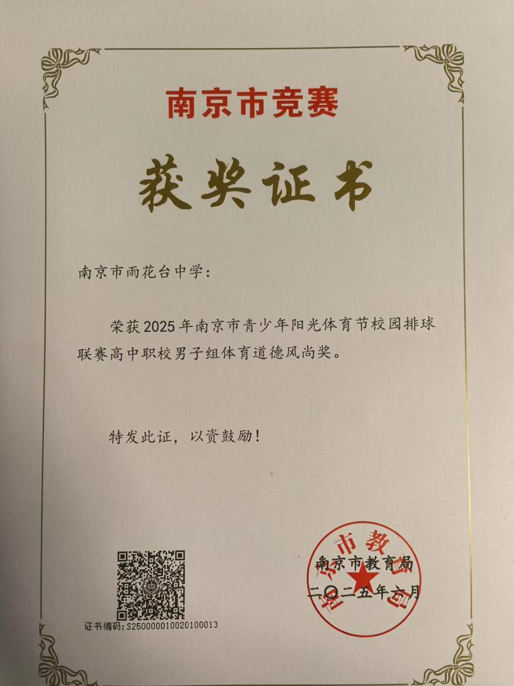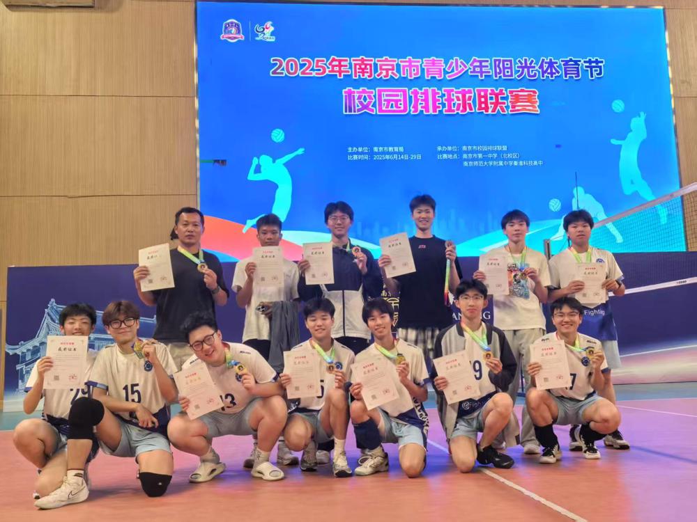 雨花台中学在2025年南京市青少年阳光体育节校园排球联赛中获高中职校男子组一等奖