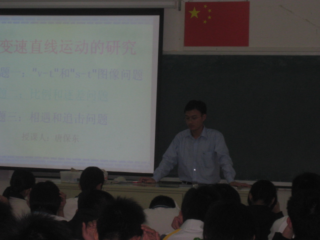 唐保东老师开设的《匀变速直线运动规律的研究》是一节习题课,对于这种课型,一般的公开课很少开,原因是这种课型缺少亮点,很难上成一节优质课,但唐老师从课堂作业入手,分析问题,引起学生的共鸣,通过一连串的分析推理和引申,学生完全进入思考状态,在唐老师的带领下化解了一个个“简单”的问题,最后当唐老师归纳总结时才意识到已经学会了“比值法和逐差法”,课堂讨论气氛浓厚热烈。唐老师虽然教学才一年,但已经具备了很强的课堂驾驭能力,盛校长课后高度肯定了唐老师,他认为仅仅一年的时间,唐老师上课简直判若两人,进步神速,同时他很感谢教研组对年轻老师不遗余力的培养和指导。