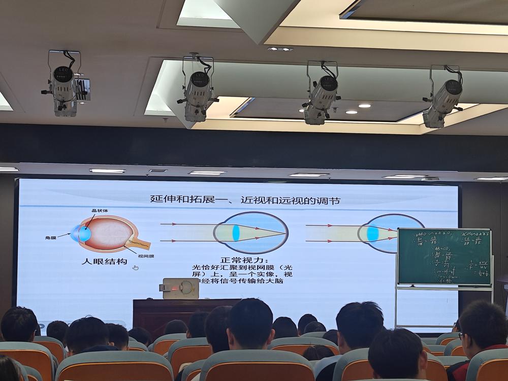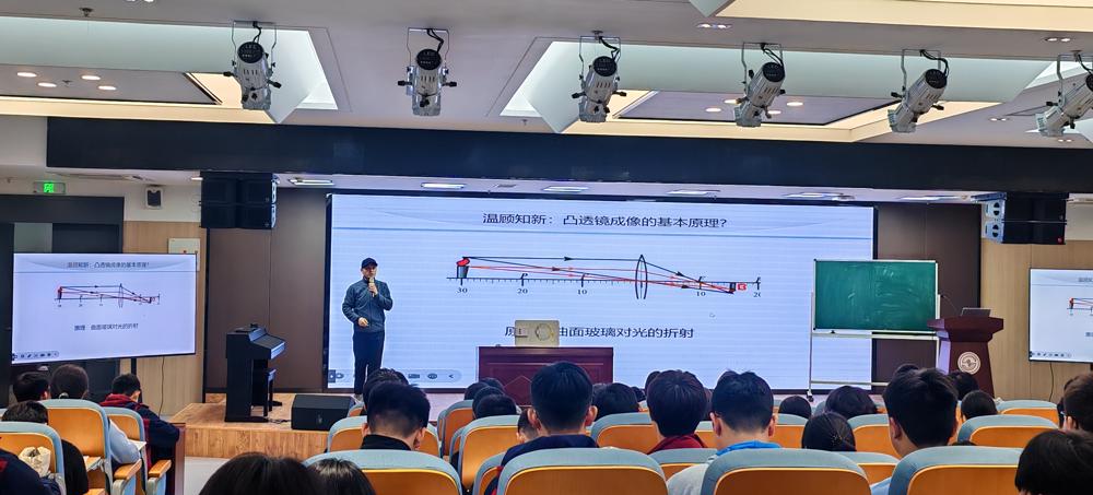 唐老师的公开课以“美育启智、理通本质”为核心,立足初中凸透镜成像基础,向高中知识深度延伸。课堂上,唐老师从凸透镜基本原理切入,引导学生层层推导分析凸透镜成像公式,实现从直观感知到逻辑推理的跨越;随后延伸至眼睛调节机制,结合近视、远视的矫正原理,讲解OK镜的科学原理,将物理知识与用眼护眼、生命尊重相融合,让课堂兼具理性与温度。在知识拓展环节,唐老师对比柱形镜与凸透镜成像差异,精准剖析成像特点不同的本质原因:凸透镜切面为球面,各方向均呈圆形,而成像上下、左右均颠倒;柱形镜仅水平方向为球面,竖直方向为平面,故仅左右颠倒。这一深度解析,有效打通初高中知识壁垒,启发学生透过现象把握本质。