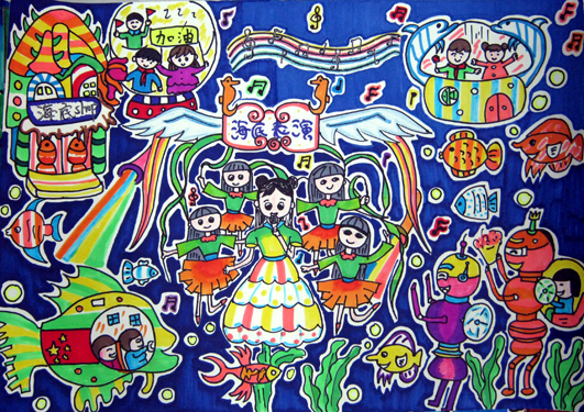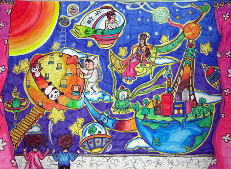 南京市第16届科技创新大赛科幻画一等奖作品《宇宙乐园》 初一(14)班 笪梦圆 雨花区科技创新大赛科幻画二等奖作品《海底世界》 初一(14)班 徐文茜
