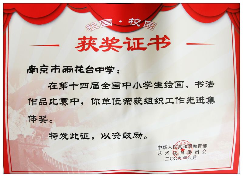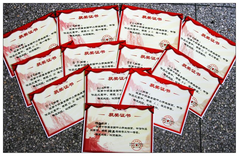 我校在第十四届全国中小学绘画、书法比赛获“组织工作先进集体”,这是连续三年被教育部艺术委员会授予“组织工作先进集体”奖,在本次比赛中八位同学获全国一等奖、二十几位同学分获全国二、三等奖,另外三十几位学生获省级优秀奖。