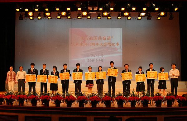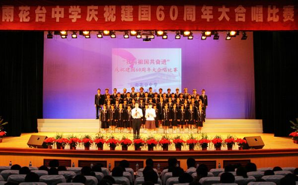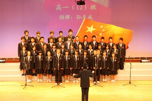 来自高一年级12支合唱队、600多名师生用歌声喜迎祖国六十华诞。穆耕森校长、盛云生常务副校长、朱淮源副校长、张鹏丽副校长、高一年级部管委会、瞿田东主任等领导、艺术教研组老师们观看了比赛并担任评委。