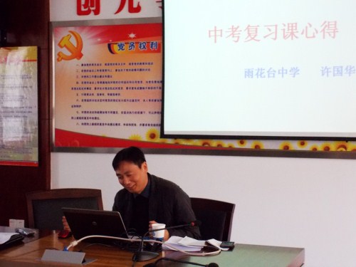 孙苹、朱敏、殷新宇、干玲玲老师分别开设了复习公开课;初三备课组长许国华老师开设了微型讲座《初三复习点滴》。活动最后,区语文教研员戴锁清老师做了讲话,戴老师评价雨中语文教师都有一颗“温润语文心”,并指出初三语文复习要注意阅读复习的选点,加强方法的指导,关注课堂的细节。全区语文教师都表示获益匪浅。