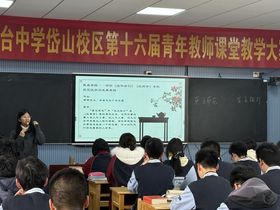 雨花台中学岱山校区王子秋老师则以《“真的人物”——〈红楼梦〉“宝玉挨打”“黛玉葬花”探究》为题,为高一(2)班的学生呈现了一堂沉浸式整本书阅读探究课。王老师以“为何将宝玉挨打与黛玉葬花两个情节放在一起探究”为核心问题,引导学生从宝黛关系的发展脉络入手,梳理两大事件在人物塑造、情感表达、主题深化上的内在关联,带领学生走进“真的人物”的内心世界,体会《红楼梦》中复杂的人性与深刻的悲剧意蕴。课堂以问题链驱动探究,以文本细读落实素养,让学生在对比研读中读懂人物、读懂作品,为高一整本书阅读教学提供了鲜活的实践案例。