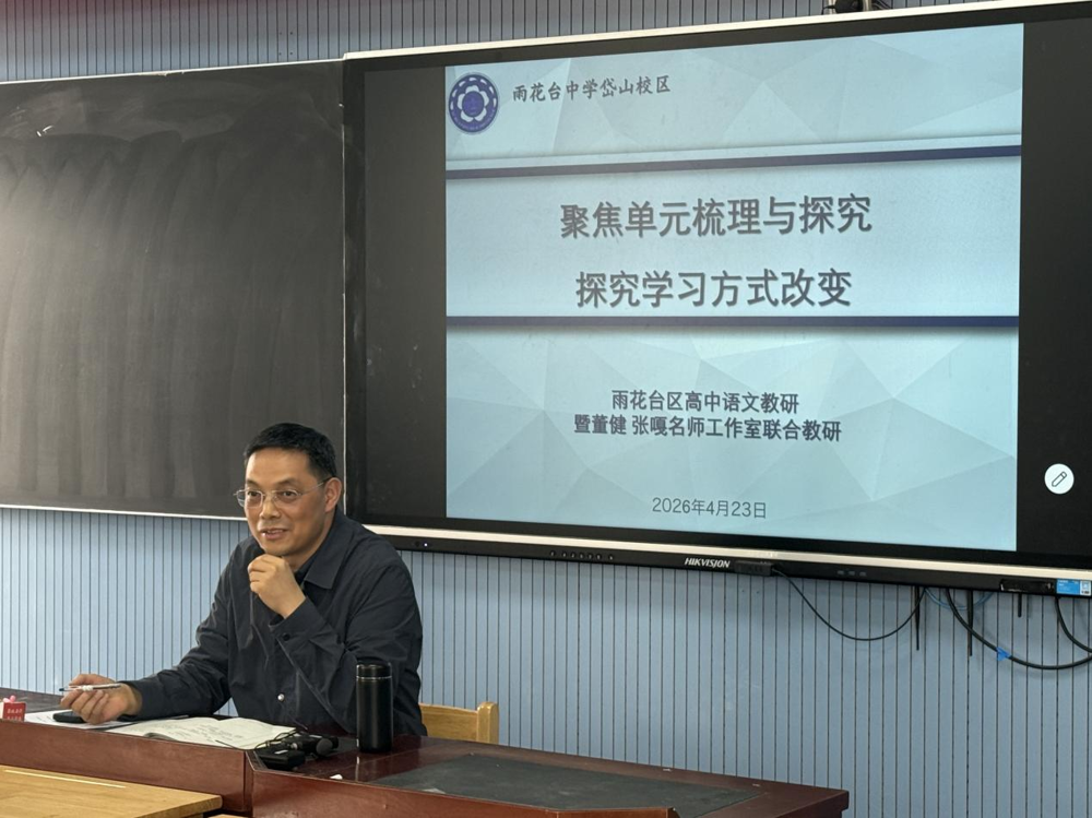为深化新课标背景下高中语文单元教学改革,探索“梳理与探究”学习方式的有效路径,提升区域高中语文课堂教学质效,2026年4月23日下午,雨花台区高中语文教研暨董健、张嘎名师工作室联合教研活动在雨花台中学岱山校区成功举办。雨花台区和江宁区的高中语文教师齐聚录播教室2,共同观摩示范课,参与研讨交流。本次活动邀请南京市第一中学包旭东老师做专家点评。