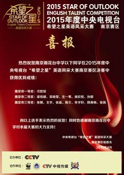 昨天,在南大鼓楼校区举行的2015“环亚琅文杯”中央电视台“希望之星”英语风采大赛南京赛区颁奖典礼上传来喜讯。我校初中部禤哲培等多名学生荣获南京市初中组一、二、三等奖。初中英语组荣获南京赛区最佳组织奖。龚娟老师获优秀指导老师奖。