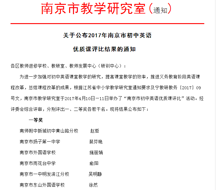 为进一步加强对初中英语课堂教学的研究,提高课堂教学的效率,推进义务教育阶段英语课程改革,总结课程改革的成果,南京市教学研究室于2017年4月10日—11日举办了“南京市初中英语优质课大赛”。