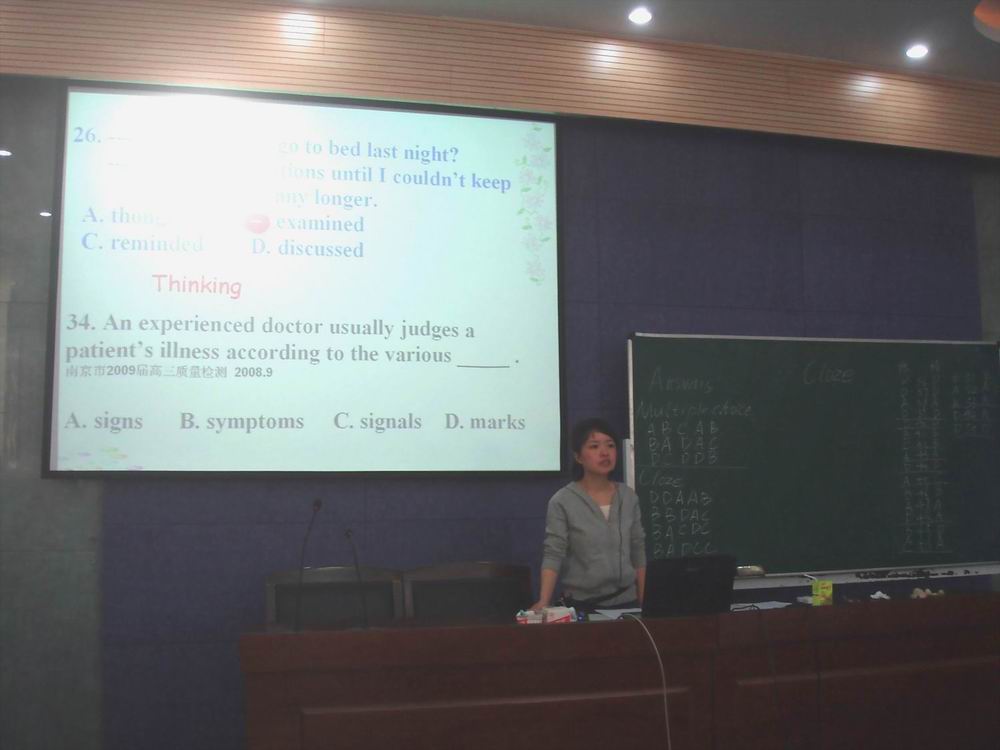 这节课以“盐城市08--09学年度高三第二次调研考试英语试卷”为材料,着重讲评其中的单选题和完形填空题。亮点有:1、让传统讲评课出新。以“A day, a solving”(每日一题)的形式,让学生课前出题、课堂提问并讲解,导入新课。其后在讲评阶段,突破束缚,不盲求高三讲评课“量大、节奏快”,而是适度给予学生时间并多方面引导学生静心思考和表达,从而在很大程度上改变了高三讲评课唯教师讲解的单向知识传授方式。2、细分析、重策略。在“重头戏”——完形填空题讲评中,多角度阐述语知运用和解题策略,并使之渗透到分析讲解中。精选“错题分析练习”,让学生不断模仿、“迁移”和总结,巩固拓展。