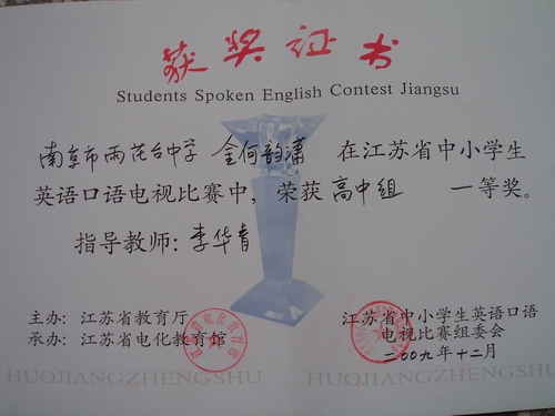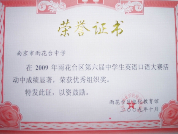 高三(1)班金何韵潇同学荣获江苏省中小学生英语口语电视比赛高中组一等奖,高三(4)班何晴同学荣获南京市中学生英语口语比赛二等奖,高三(8)班周光伟同学荣获雨花台区中学生英语口语比赛二等奖,我校荣获雨花台区第六届中学生英语口语大赛优秀组织奖。