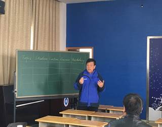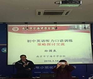 然后,来自宁海中学分校的英语教研组长孙国良老师给老师们做了《初中英语听力口语训练策略探讨交流》的专题讲座。孙老师详细介绍了他们学校人机对话考试复习的近期安排和他们的优秀做法。
