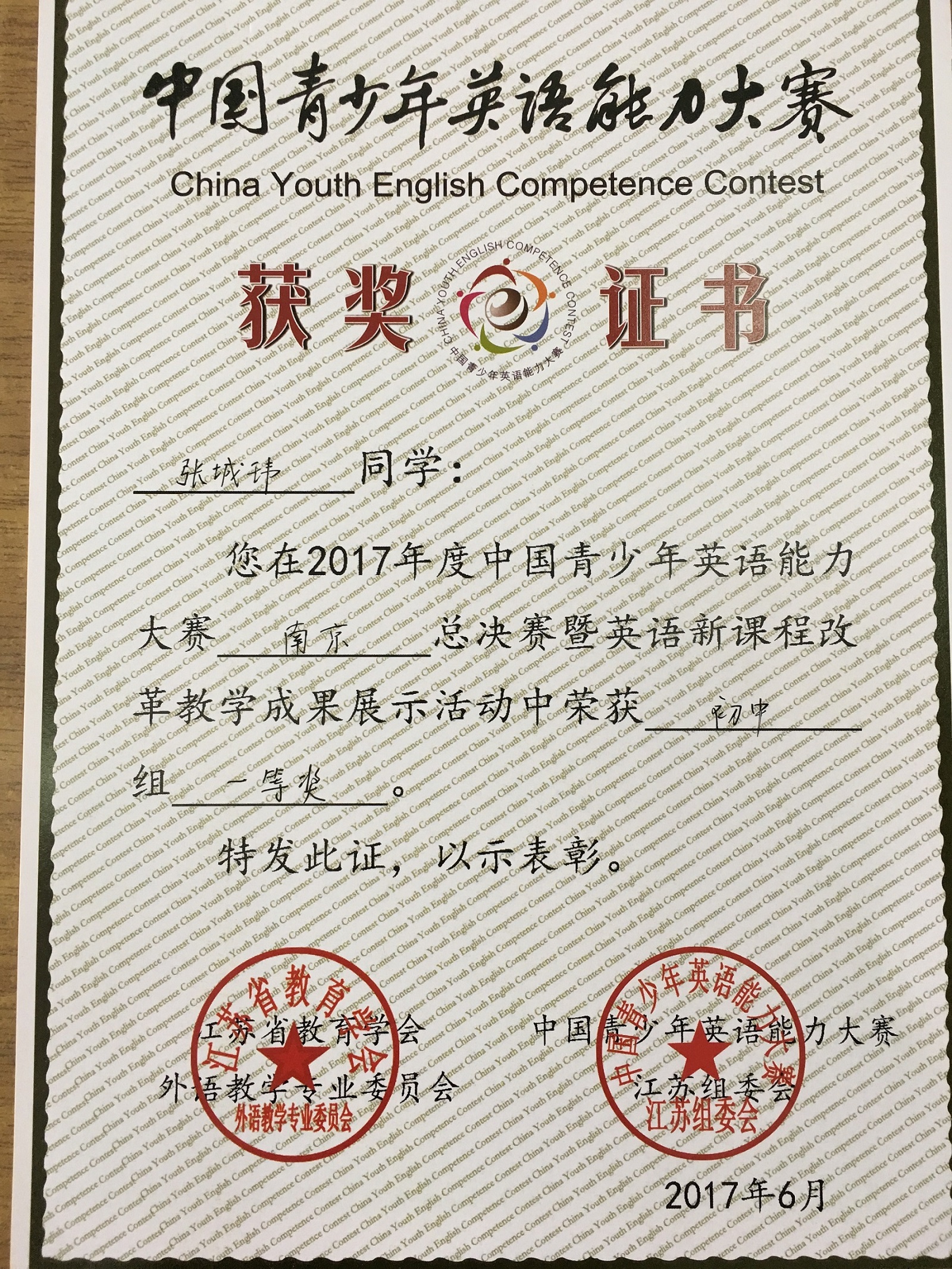 我校张城玮同学在此次比赛中获得南京市一等奖;崔曼晨,裘卓然,谢逸凡,方雅昕,张予宸,易辰星,徐靖宇,张子言八位同学获得南京市二等奖;张嫁睿,卲雨婷,马睿颖,王文海,马咏乐,濮锦泽,徐轶轩,获得南京市三等奖!