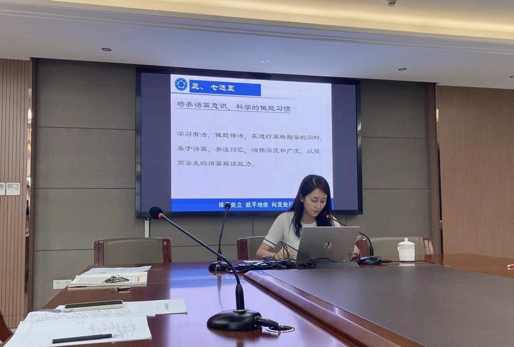 陈琨老师,作为上一届的高三教师代表,则给出了关于完形填空、语法填空和写作三个专项的具体做法。例如:为了提高学生完形填空的阅读能力,她所在的英语组开展整个单元词汇教学、坚持阅读teens和China Daily。针对学生平时暴露出来的语法问题,陈老师指出她们会完整系统地帮助学生复习各项语法知识和易错点,并结合新高考的要求做到重点突出。针对作文问题,陈老师她们采取了指导学生进行阅读积累再输出,每位备课组的老师都能做到面批和及时反馈,偶尔也会让学生进行小组评分,互相激发灵感,使得作文评讲课不再是老师一言堂,取得了意想不到的效果。