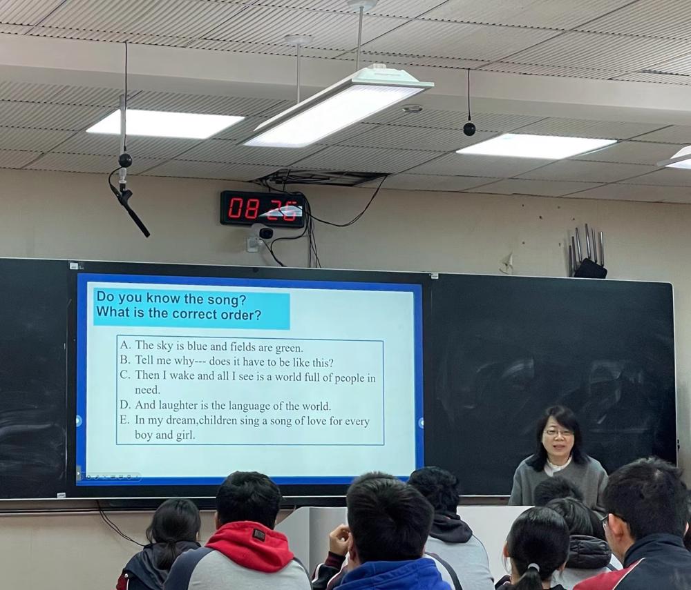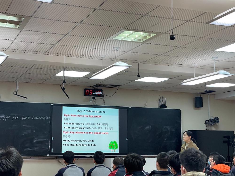 周粲老师从抖音视频关于不同学生听听力的感受导入课堂,激发了学生的学习兴趣,也引出了本节课的内容有关听力技巧。周老师提到,在听力前,学生需要勾画关键词汇(疑问词、人物、时间、话题);在听力中,学生需要记下关键词(数字、年份、实词);在听力后,学生需要调整心态,继续往下答题。此外,周粲老师具体介绍了听力中常考的五大类型题:数字信息、地点场景、身份关系、观点态度以及行为活动,她列举了提问方式和解答不同类型题目的技巧。接下来,学生以考官的身份通过看录音稿逆向设计听力试题(含选项),该活动既巩固了所学技巧,又形成了课堂生成。