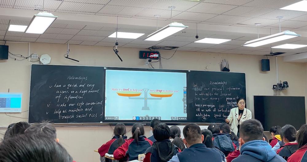 尤丽莉老师所展示的课堂内容是必修三第一单元阅读文本The Internet: a world without frontiers。尤老师从近期热门的Chatgpt引入文本,邀请学生向AI提问,课堂气氛热烈,很好地引出主题。此外,尤老师关注文章的体裁——议论文并以此为抓手让学生找文章结构,在每个部分又细致地分析了文章的写作技巧,如:举例子、对比等。并且她通过让学生分析作者的情感态度,从而引出网络的弊端。在学生积极的讨论下,搭建了写作的脚手架,让学生在写作时将课堂所学很好的融入其中。尤老师强调我们要将网络作为帮助自己的工具而不是毁掉自己的陷阱,这不仅提醒了高中生如何正确使用网络,也培养了学生的批判性思维。
