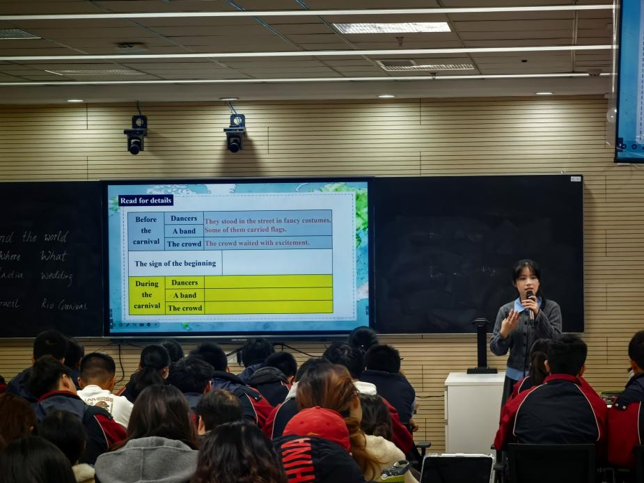 第一节研讨课由来自雨花台中学的朱婉老师执教。朱老师设定了清晰明确、层次丰富的教学目标。她引导学生通过本课学习,能够描述印度的婚礼习俗和里约狂欢节的盛大场面;掌握描述场景与情感的关键词汇;并运用所学词汇描绘婚礼仪式和龙舟赛的场景;深入分析并尝试运用Alex旅行日志中的写作技巧;最终达成能够运用所学撰写一封邀请信的综合语言输出目标。课堂设计紧密围绕语境创设,力求知识学习与语言应用相结合。