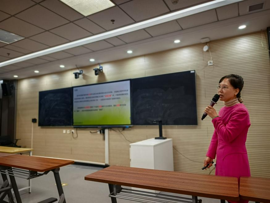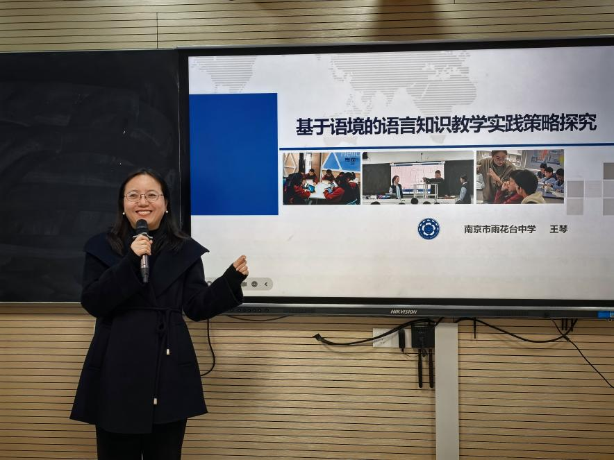 教学展示后,是两场紧扣主题的专题讲座。雨花台中学的王琴老师首先作了题为《基于语境的语言知识教学实践策略探究》的分享。王老师从审视当前教学中存在的现实困境入手,明确了语境化教学的努力方向,并深入探讨了行之有效的实践策略,为一线教学提供了宝贵思路。
