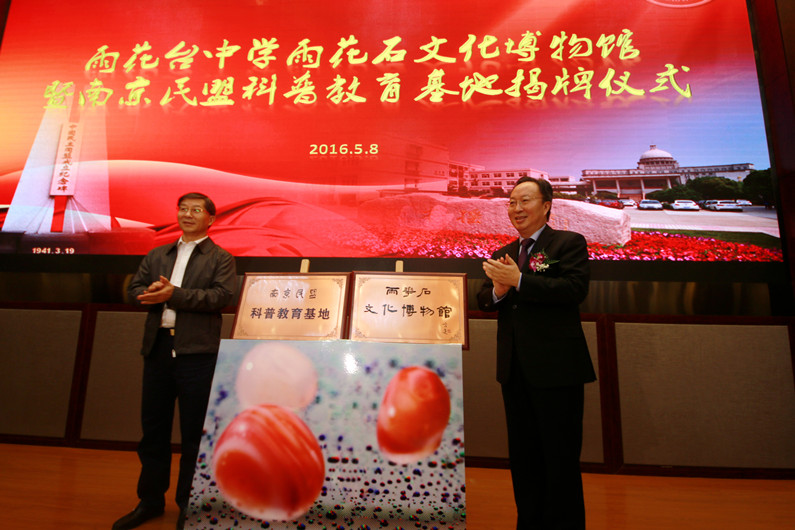最后,由国土资源部副部长曹卫星先生和南京市常务副市长刘以安先生共同揭牌。本次仪式简洁而又隆重,短小精悍而意义非凡。这并不是结束,而是一个开始,是一个民盟科普教育和雨花石文化传播的新篇章的开启。让我们共同预祝:雨花石文化博物馆越办越好,祝愿民盟科普教育基地绽放光芒!