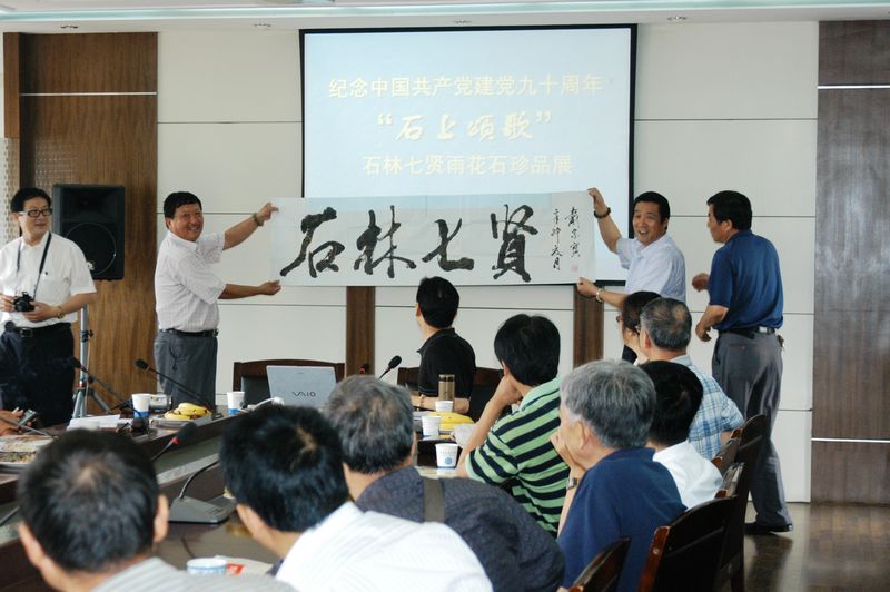 2011年6月11日,南京市雨花台中学雨花石文化博物馆迎来了庆祝中国共产党建党九十周年“石上颂歌”—石林七贤雨花石珍品展。此次展览由南京市雨花台中学雨花石文化博物馆主办、江苏省收藏家协会赏石专业委员会、南京雨花石协会、西祠中国南京雨花石俱乐部网协办。上午10点,雨花石文化博物馆第四期展览正式开始。出席本次展览的嘉宾有:雨花台中学校长穆耕森、雨花台中学党委书记候唯华南京雨花石协会会长戴宗宝、常务副会长骆嘉刚、江苏省收藏家协会赏石专业委员会主任戴康乐、副主任周德麟、倪传明、南京雨花石协会副会长仪征雨花石协会常务副会长王定、南京雨花石协会副会长六合雨花石收藏家协会会长吕晓红、雨花石文化馆馆特邀馆长王建平、张志川与“石林七贤”藏石家贾平、柏贵宝、刘云海、夏存新、沈文惠、曹小宁、李陟及南京雨花石协会代表等120人参加了开幕式。