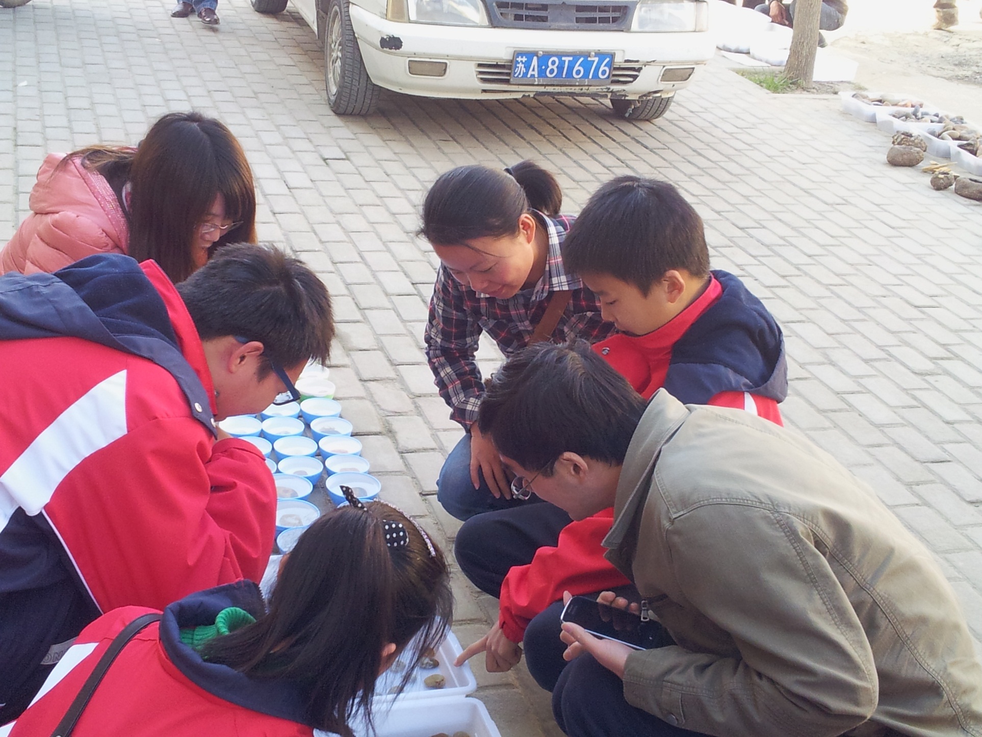 2013年11月17日晨,我校高一历史备课组带领雨花石兴趣小组的学生来到位于六合横梁的雨花石交易市场。太阳初升,整个交易市场人头攒动,一片繁忙景象。看客与藏石人讨价还价之声不绝于耳。我校师生徜徉其中,不禁感慨来自大自然鬼斧神工的杰作,更感受到了每一颗雨花石被藏石人所赋予的美好的文化意境。大家都从心里祝愿雨花石的明天更美好。