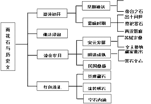 雨花石与历史文化:在雨花石将近六千年的发展历史进程中,一直追随社会的发展而不断获得新的生命与内涵。从早期神话,到宋元发展,明清成熟,民国鼎盛,再到近现代的内涵拓展,具有了其他种类观赏石所不具备的非常鲜明的新的人文价值,似乎生与死、理想与现实在这里都已泯消界限,逝去的生命和健在的生命获得了精神上的永恒。