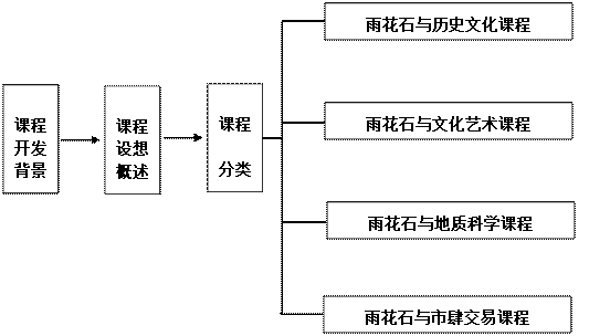 结合学校现有课程基础,围绕雨花石文化,进行课程的优化、重组,建构一系列物态模型,将教学重点、难点等核心内容直观化、形象化。建构非物态模型,引导学生对具体形象内容进行抽象概括,从而加深对所学知识的理解。课程开发的总构想为: