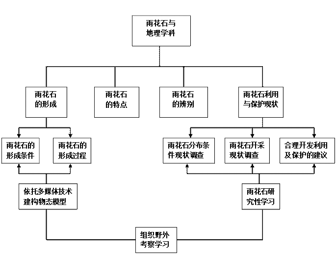 雨花石与地质科学:依托多媒体技术构建雨花石形成过程的一般模型,建构物态模型,将教学重点、难点等核心内容直观化、形象化。如开设《彩石的奥秘》选修课,组织学生野外考察,探讨雨花石的形成条件和特点,学会精选优质雨花石。开展研究性学习:雨花石产业发展现状和问题调查,参观雨花石工艺厂。