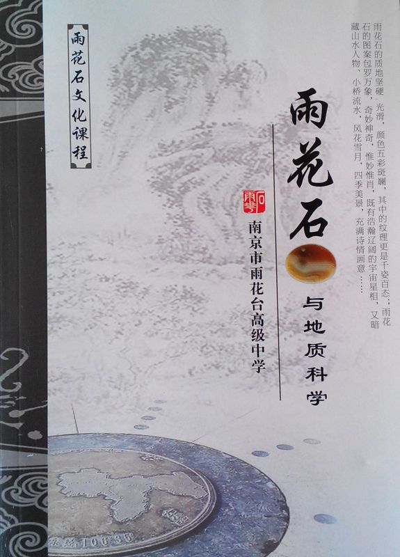为了进一步普及南京雨花石的科学内涵,弘扬校园雨花石文化,将雨花石融于课程之中,并借助于课程的开展,提升学生的审美情趣,提高学生道德修养,特组织编写雨花石文化系列小本教材,本套教材包括《雨花石与历史文化》、《雨花石与文学艺术》、《雨花石与市肆交易》、《雨花石与地质科学》等四本书,深入浅出地介绍了雨花石的来源及其与南京乃至周边地区地质历史发展的关系,雨花石资源的合理开发与保护,回答一些大众可能关心的问题,它为古老而灿烂的雨花石文化插上了科学的翅膀,体现了科学与文化结合。该套教材也是学生社团活动、选修课的载体,共基础年级学生学习使用。