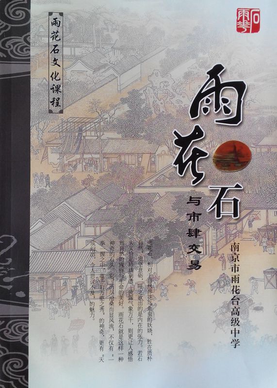 为了进一步普及南京雨花石的科学内涵,弘扬校园雨花石文化,将雨花石融于课程之中,并借助于课程的开展,提升学生的审美情趣,提高学生道德修养,特组织编写雨花石文化系列小本教材,本套教材包括《雨花石与历史文化》、《雨花石与文学艺术》、《雨花石与市肆交易》、《雨花石与地质科学》等四本书,深入浅出地介绍了雨花石的来源及其与南京乃至周边地区地质历史发展的关系,雨花石资源的合理开发与保护,回答一些大众可能关心的问题,它为古老而灿烂的雨花石文化插上了科学的翅膀,体现了科学与文化结合。该套教材也是学生社团活动、选修课的载体,共基础年级学生学习使用。